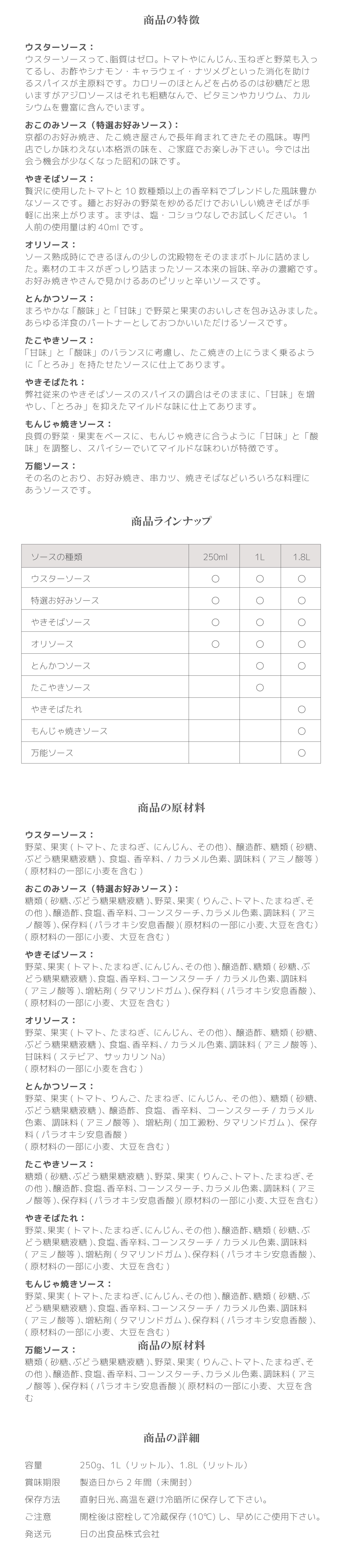 糖類(砂糖、ぶどう糖果糖液糖)、野菜、果実(りんご、トマト、たまねぎ、その他)、醸造酢、食塩、香辛料、コーンスターチ、カラメル色素、調味料(アミノ酸等)、保存料(パラオキシ安息香酸)(原材料の一部に小麦、大豆を含む)