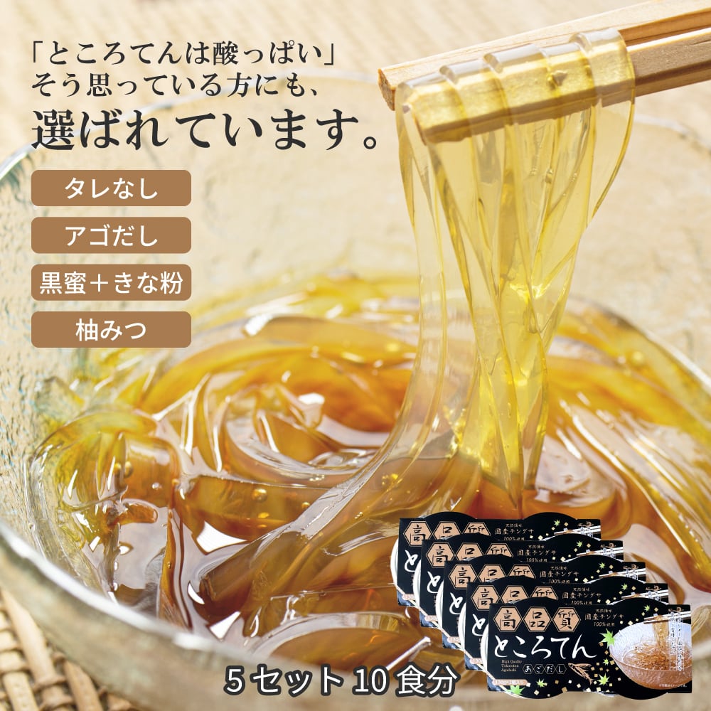 高品質ところてんは5セット10個入りでお届けします。ぜひご自宅でこだわりのダシを使ったところてんをご堪能ください。食卓が一層華やかになること間違いなしです!あなたの食事に、ぜひ加えてみてください。